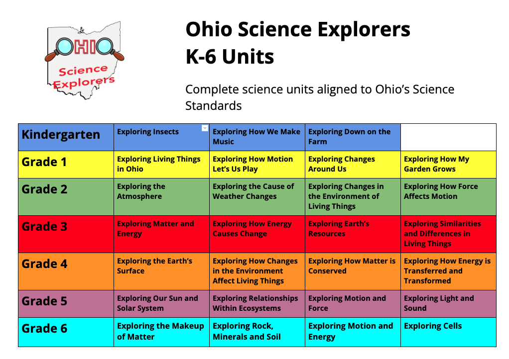 Grades 1-6 include 4 units which address ALL Ohio standards for the respective grade levels. K units include 3 units that integrate all Ohio science standards.
