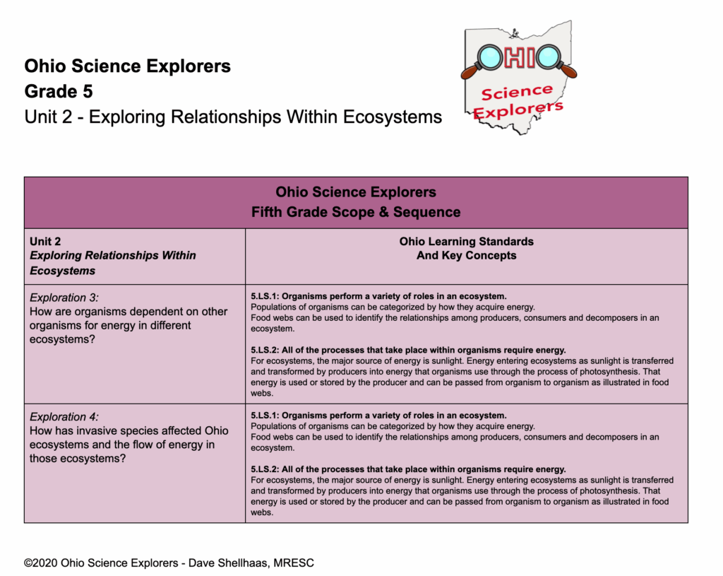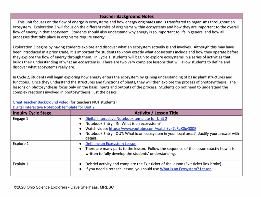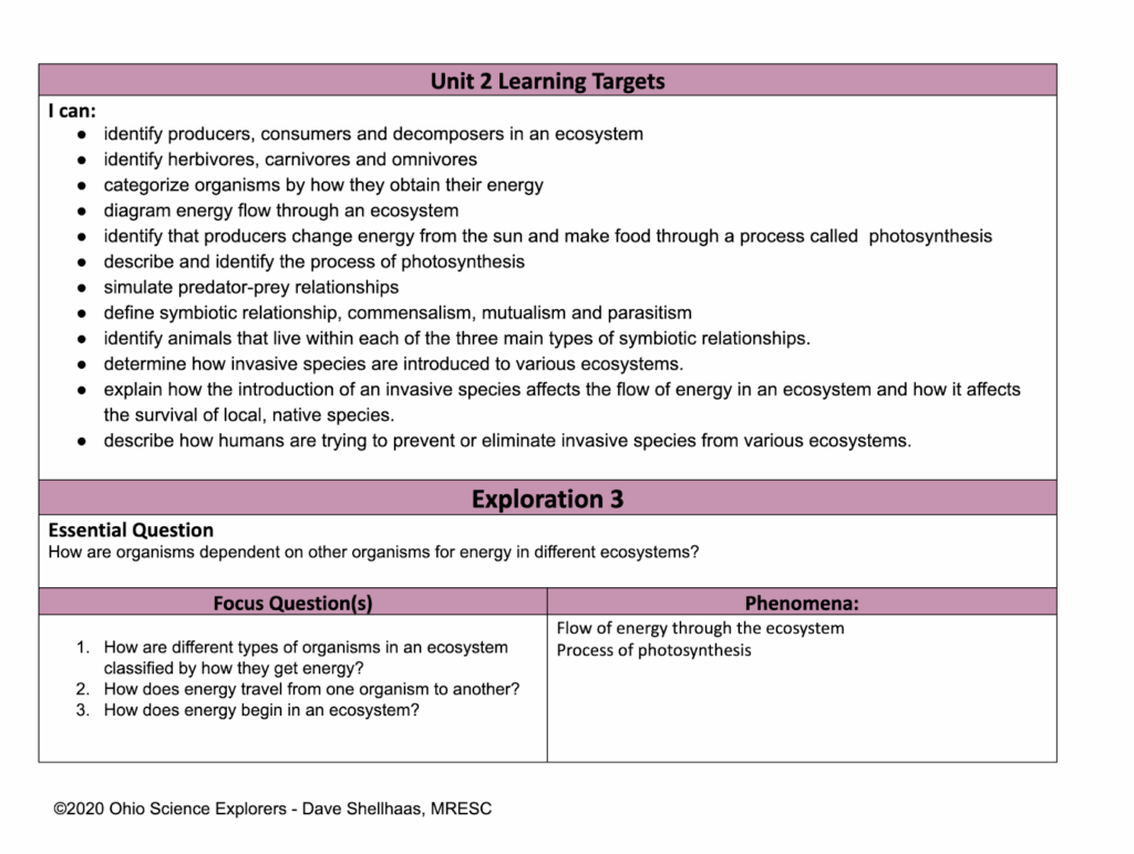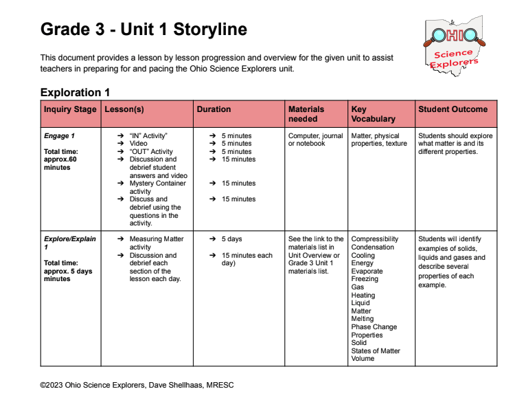All units contain the important teacher information and guidance as to where the content was addressed previously and where it will be addressed in future grades.  The information included in this session aligns directly with the Model Curriculum for the ODE.  The unit overview also includes the 5 E’s inquiry cycle stages of the learning progression.