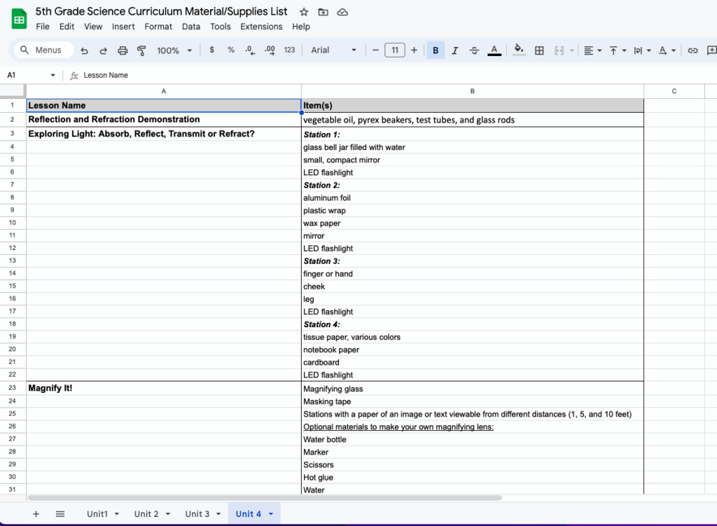 The materials list contains the materials needed for the lessons that require extra or special materials or supplies.  If a lesson only requires handouts or is digital, the lesson is not included on the materials list.
